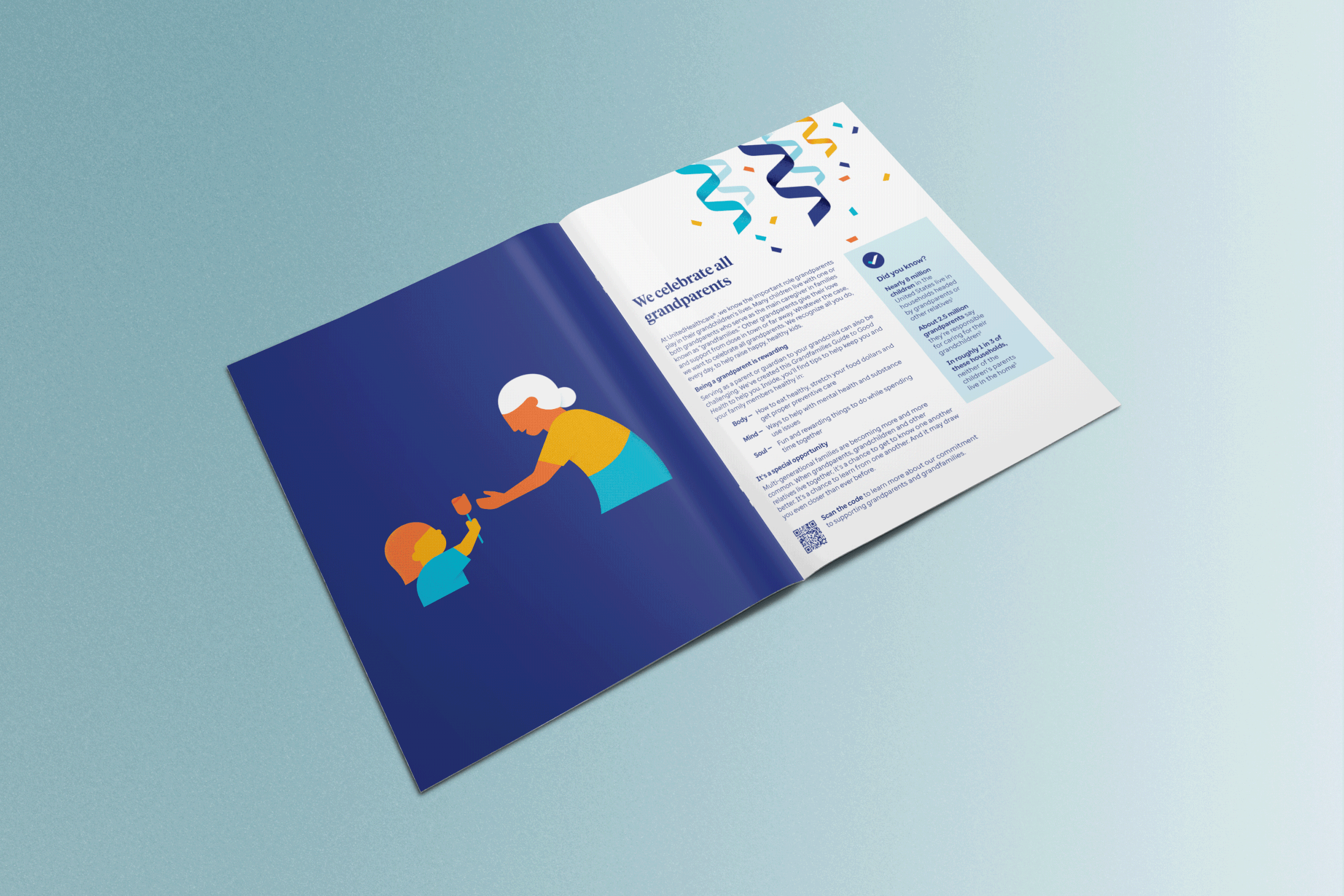 To support grandparents and the families they care for, we developed a practical, approachable booklet filled with helpful tips and guidance. Topics ranged from healthy eating and building positive habits to stretching a budget and navigating more serious challenges like substance use. Designed as a meaningful takeaway, the piece aimed to spark conversations, share support, and meet families where they are.