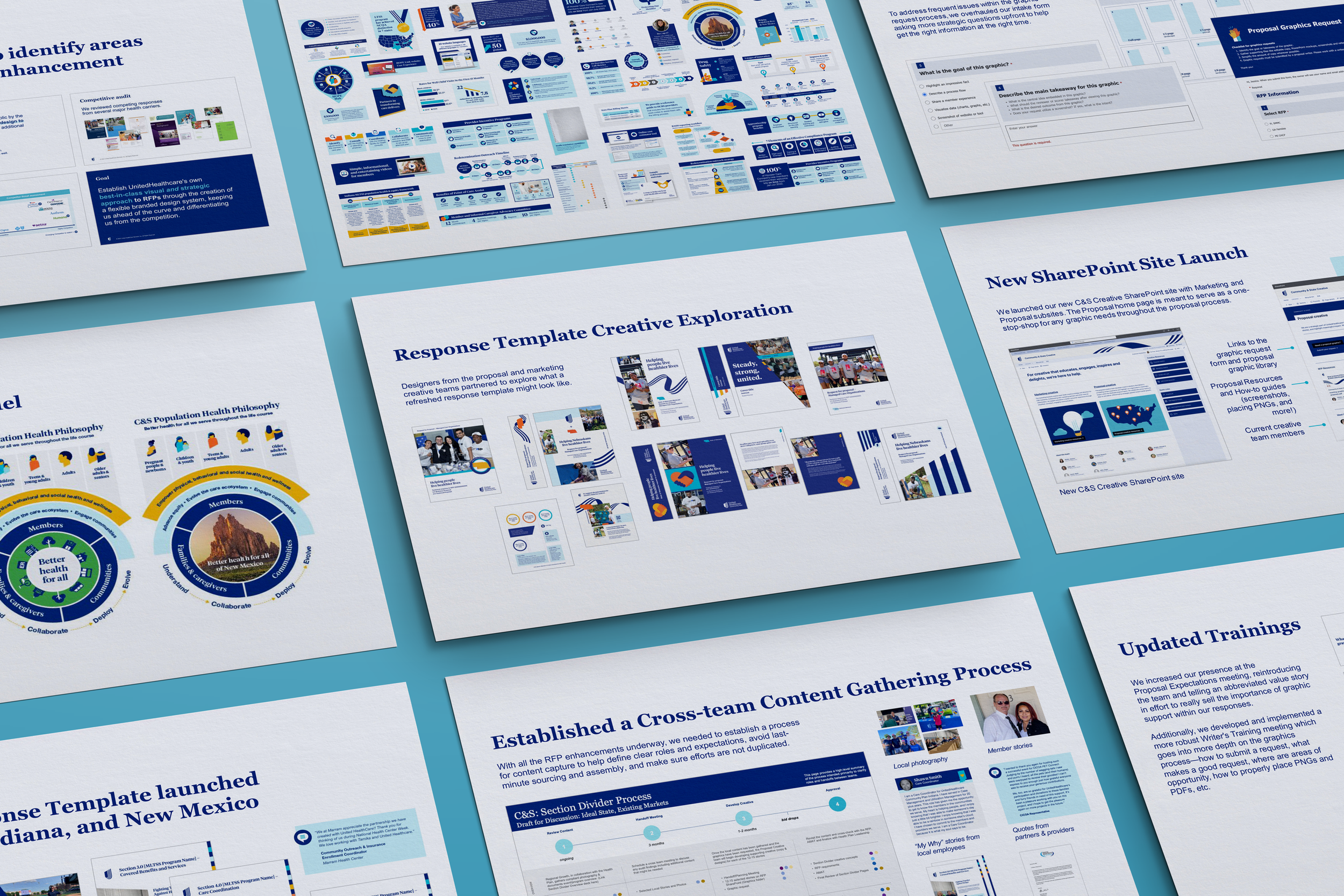 As the creative lead for the Proposal/RFP team at UnitedHealthcare, I scaled the team from one designer to a flexible structure with two designers, a project manager, and on-demand contractor support to adapt to proposal pipeline needs. During that time, these were some of our my initiatives: