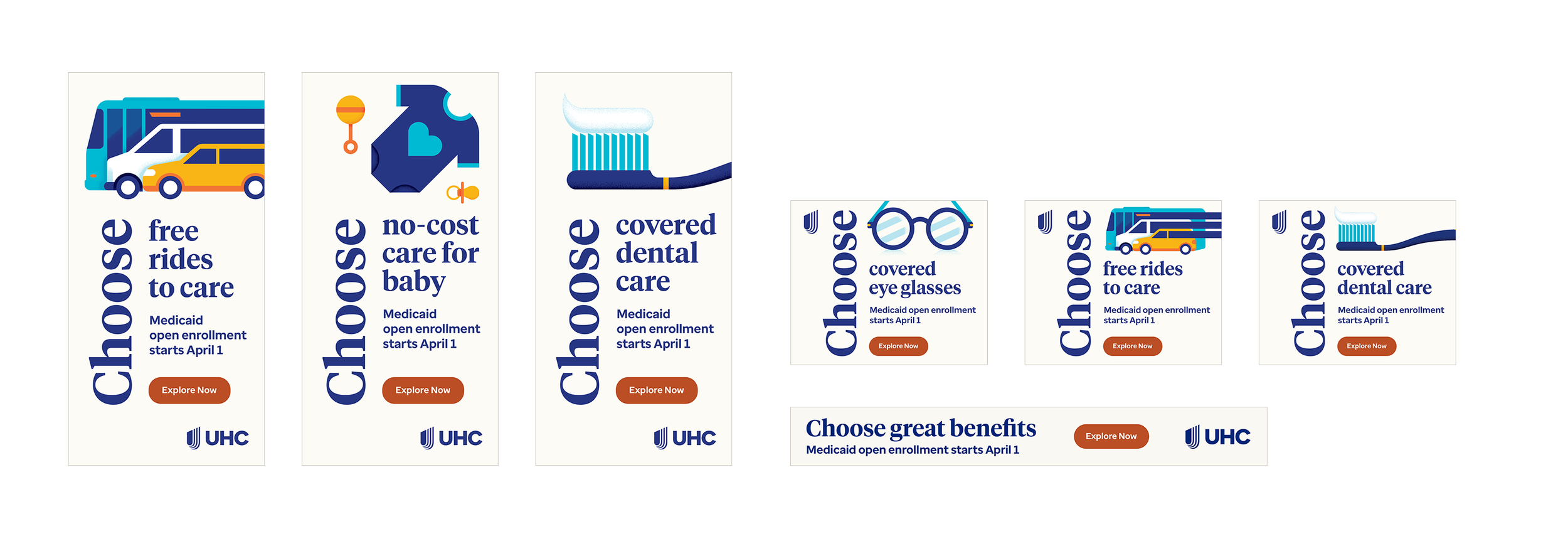 Medicaid audiences are diverse, with many members reading at lower grade levels or speaking English as a second language—so clarity was critical. We built the campaign around a single call to action: “Choose.” Tangible benefits, bold design, and inclusive visuals made options easy to understand and empowered members to act.
